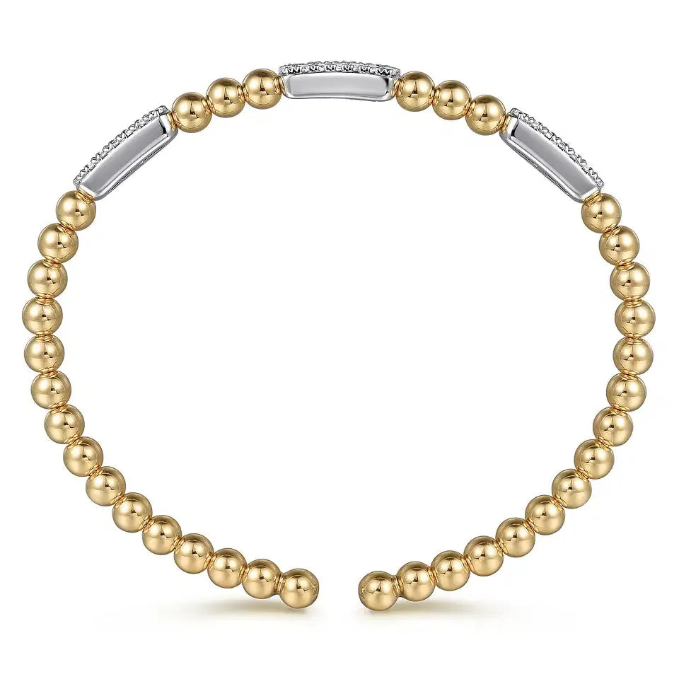 14K White and Yellow Gold Diamond Pave Three Station Bar Bujukan Beads Split Bangle Bracelet