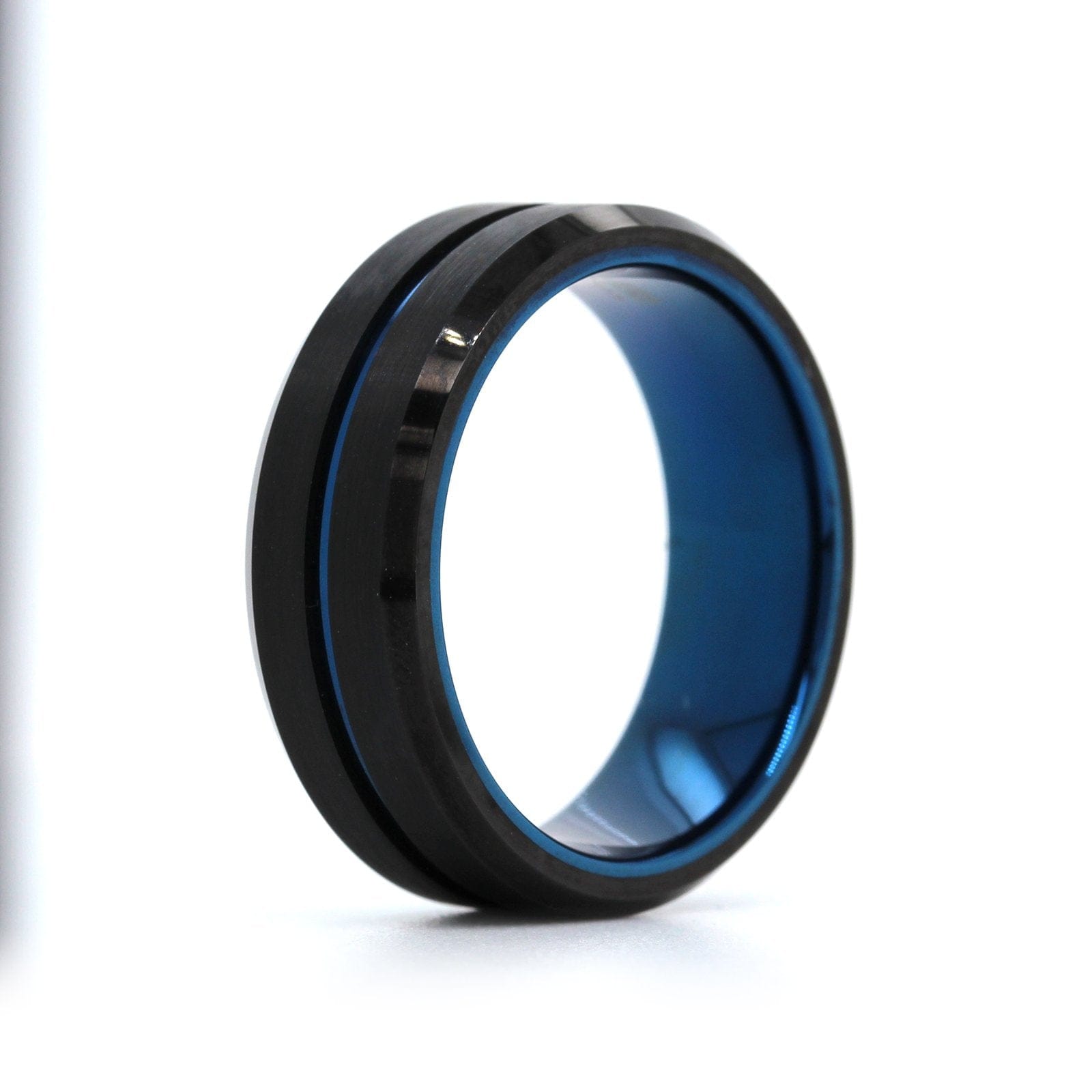 Tungsten band with high polish blue tungsten interior and center stripe and black tungsten brushed finsihed exterior with high polished beveled edges.