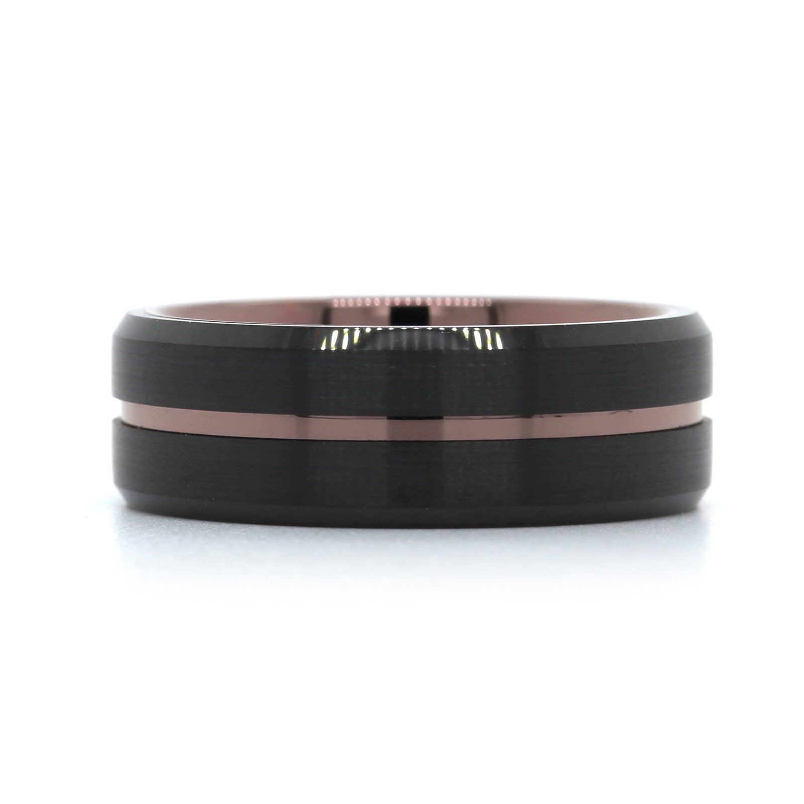 Tungsten band with high polished brown tungsten interior, stripe and black tungsten brushed finished exterior.