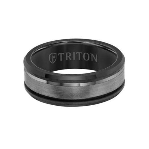 Black tungsten band with brushed center with high pol beveled edges and high polished beveled edges.