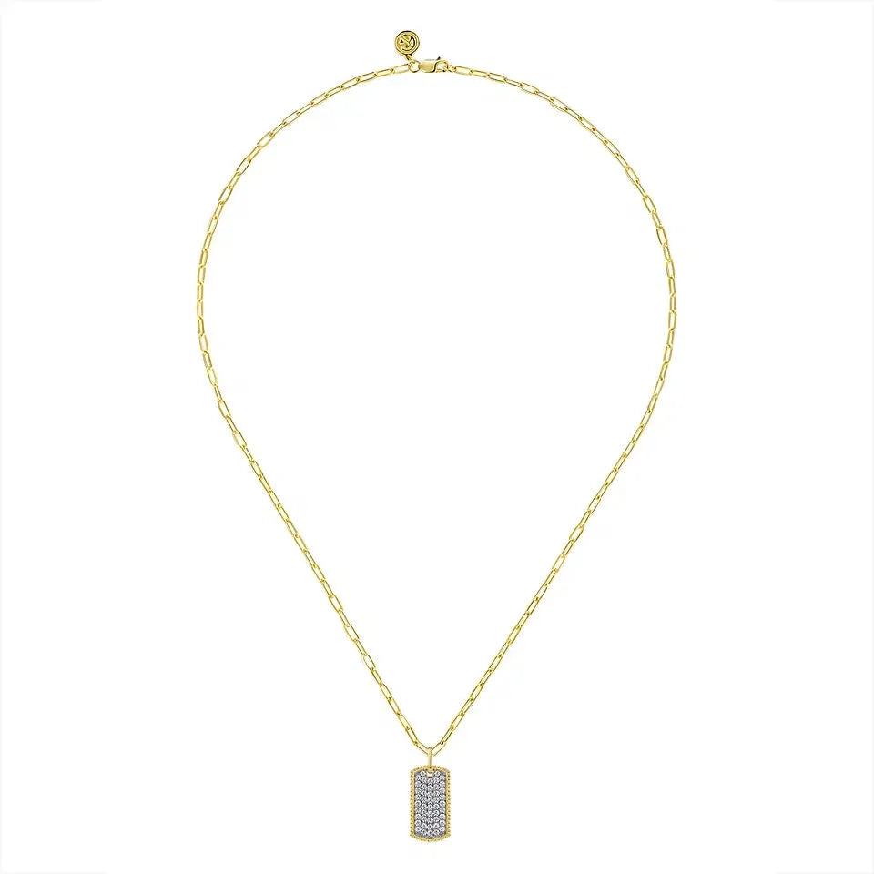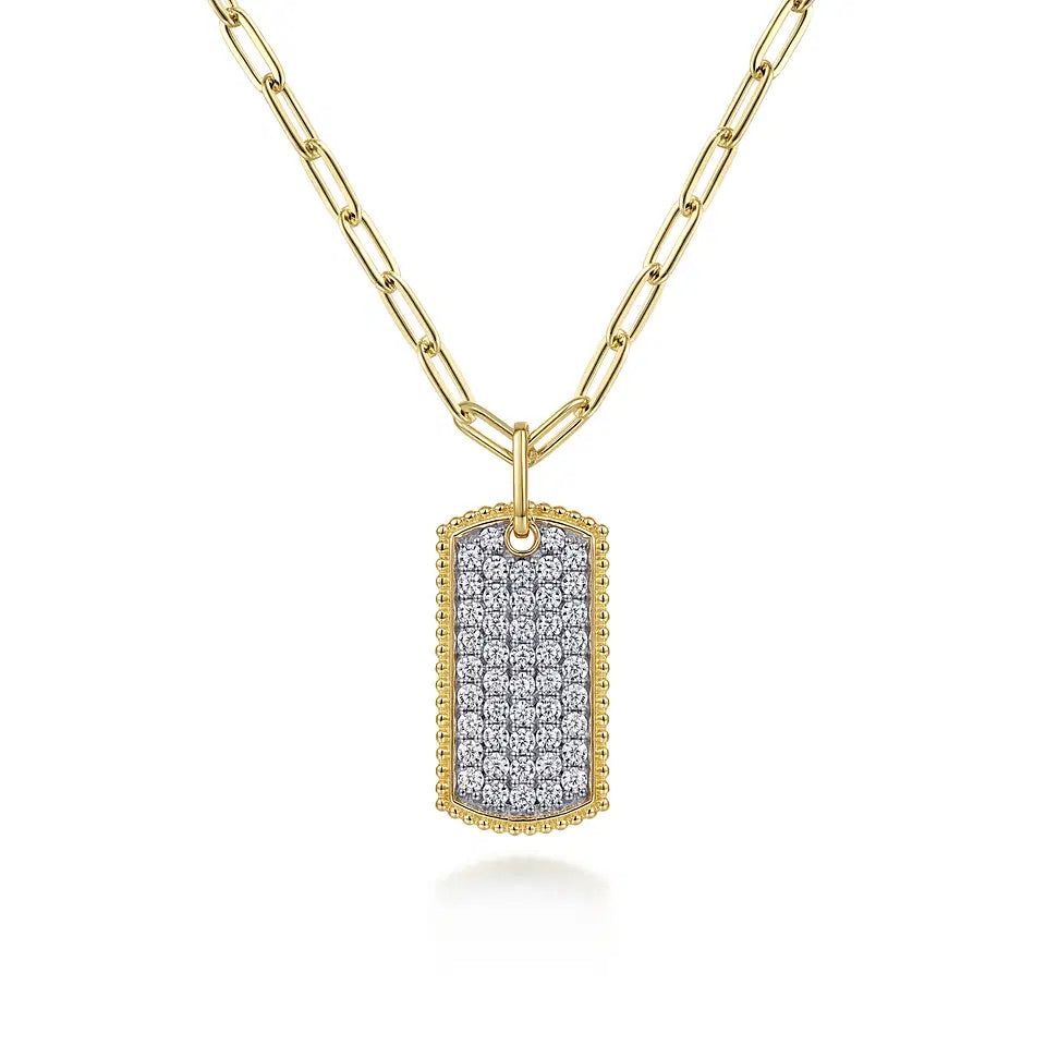 14K Yellow Gold Diamond Pave Dog Tag Pendant Hollow Chain Necklace