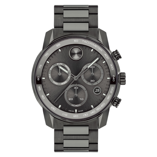 The BOLD Verso is defined by a bold, sport-inspired case and sophisticated detailing. This 44mm chronograph watch features a navy dial, Swiss Super-LumiNova accents, and a tachymeter bezel.